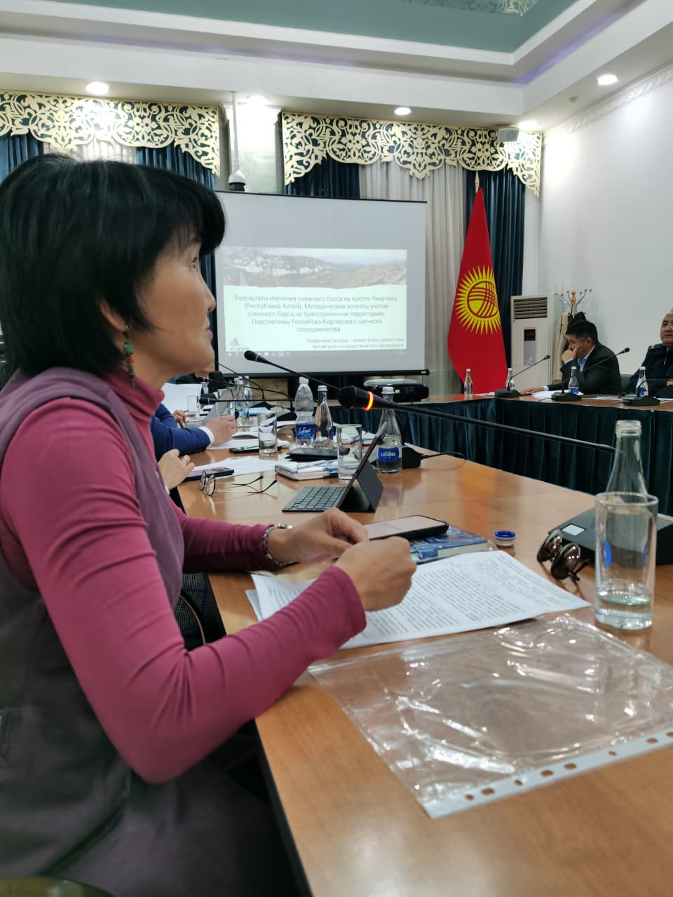 В своем выступлении Сынару Вениаминовна представила киргизским коллегам успешный опыт совместной работы Алтайского заповедника, Сайлюгемского национального парка и добровольцев экспедиции «По следам снежного барса» по мониторингу и сохранению популяции ирбиса на хребте Чихачева.