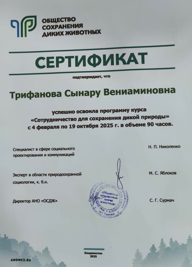 Осенью 2025 года завершилась образовательная программа «Сотрудничество для сохранения дикой природы», организованная АНО «Общество сохранения диких животных». Среди выпускников программы — Сынару Трифанова, ведущий научный сотрудник Алтайского биосферного заповедника, которая успешно освоила курс и защитила свой проект. Программа объединила теорию и практику, чтобы научить специалистов ООПТ эффективно работать с местными сообществами для защиты природы.