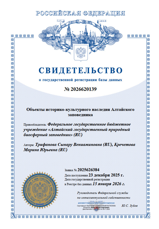 В 2025 году была создана база данных «Объекты историко-культурного наследия Алтайского заповедника» предназначенная для хранения и накопления информации о видах, структуре и составе памятников Алтайского государственного природного биосферного заповедника. Авторы базы данных стали С. В. Трифанова и М. Ю. Кречетова.