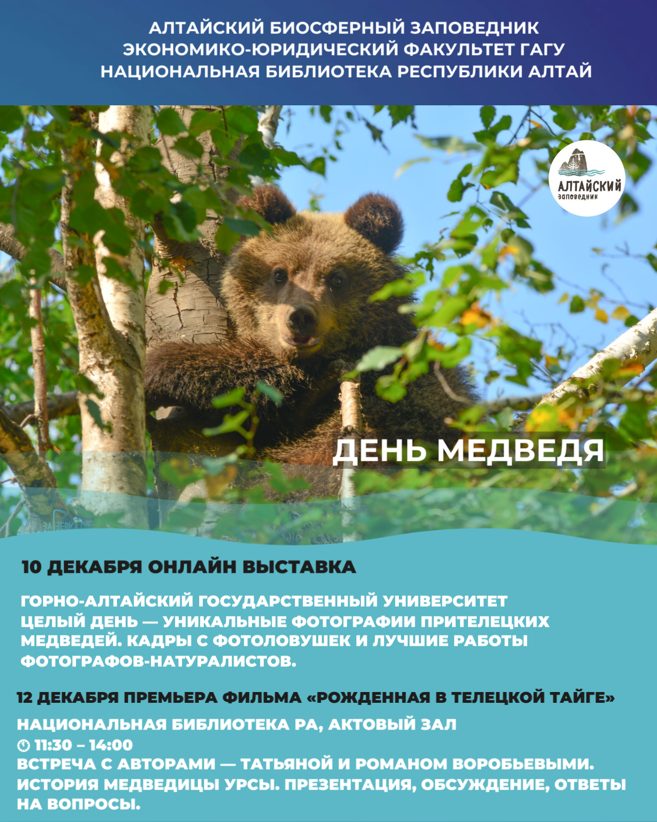 12-го декабря с 11:30 до 14:00 в актовом зале Национальной библиотеки РА состоится встреча и презентация нового фильма сотрудников заповедника Татьяны и Романа Воробьевых «Рожденная в Телецкой тайге», главная героиня которого — медведица Урса.