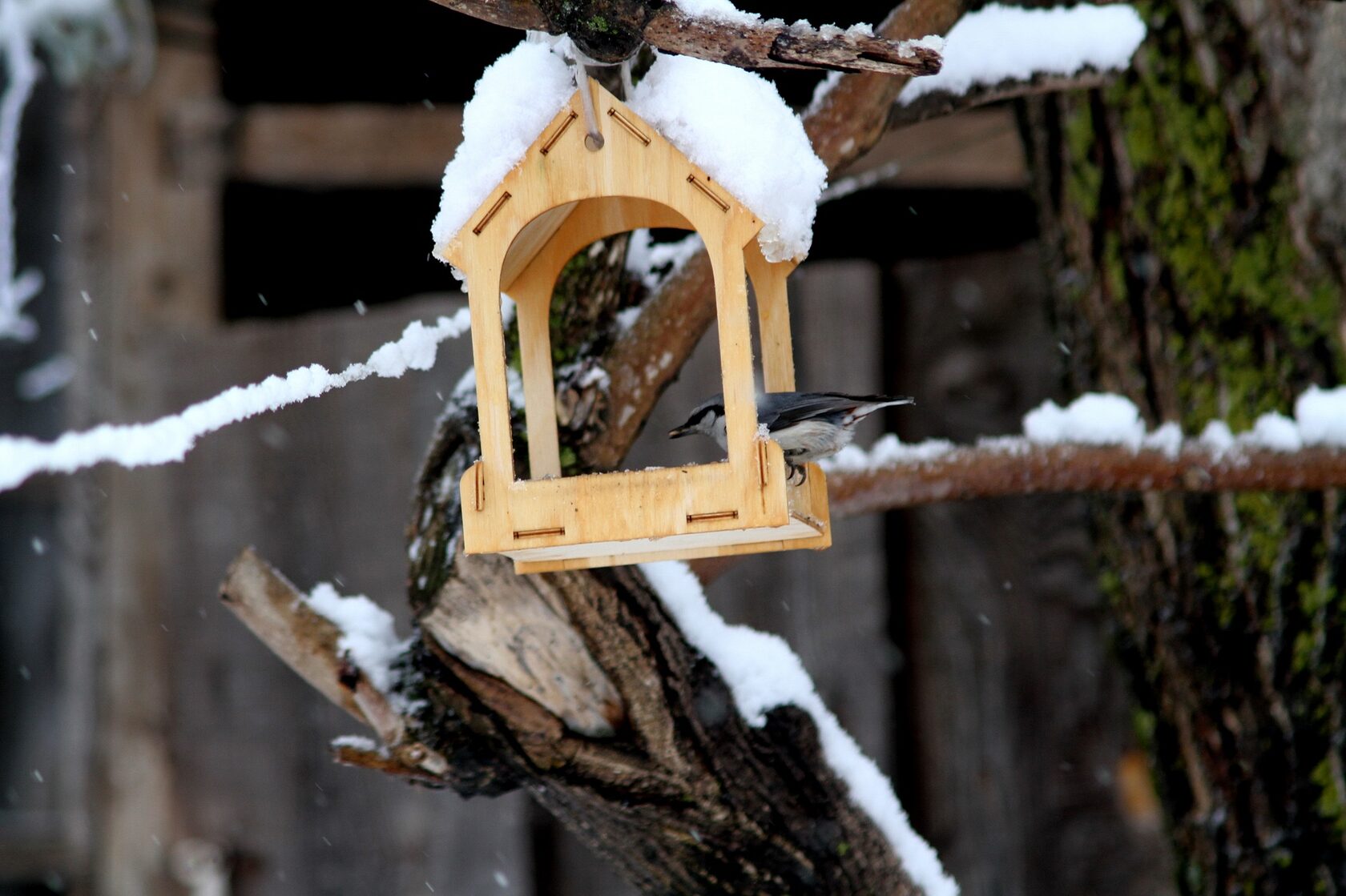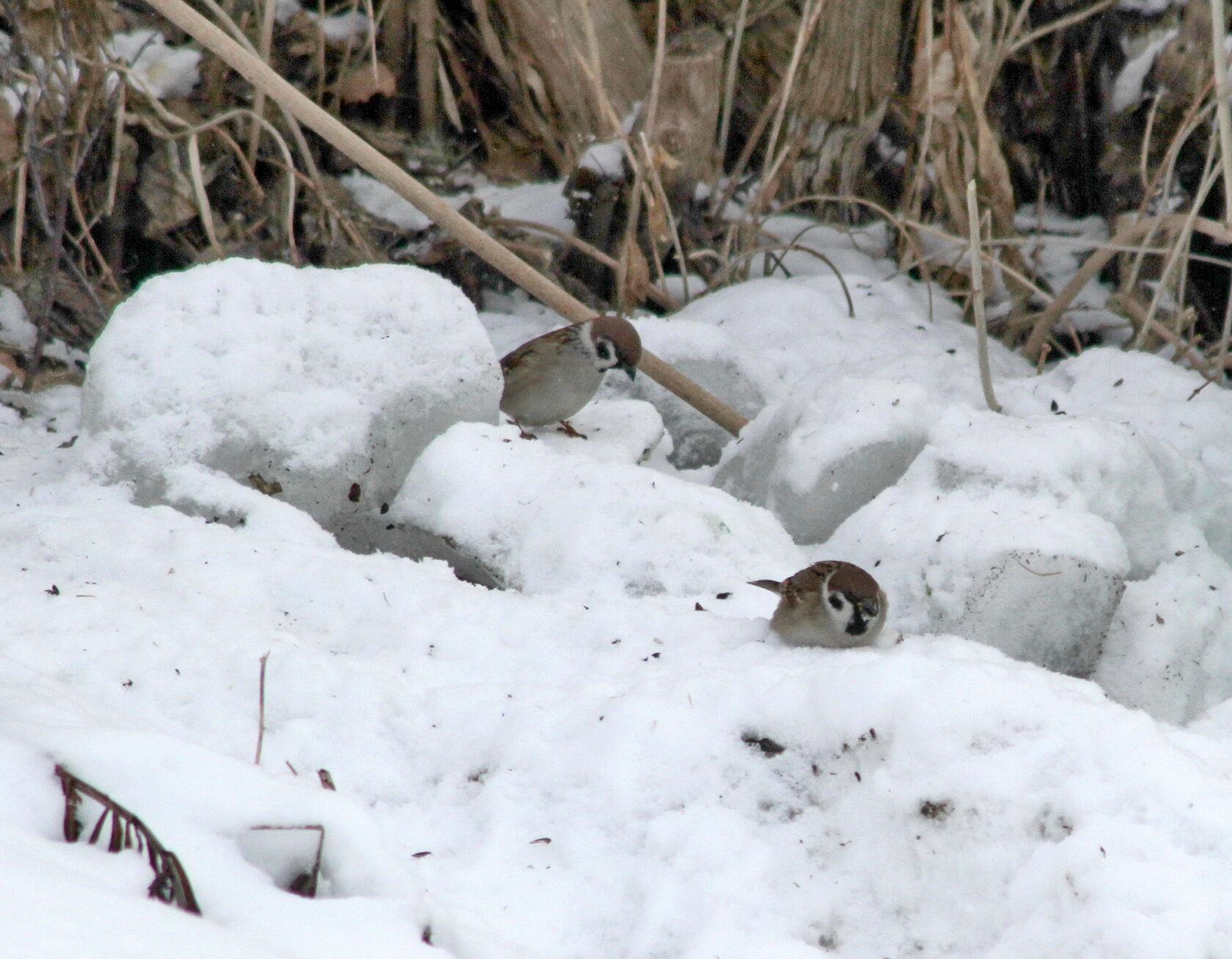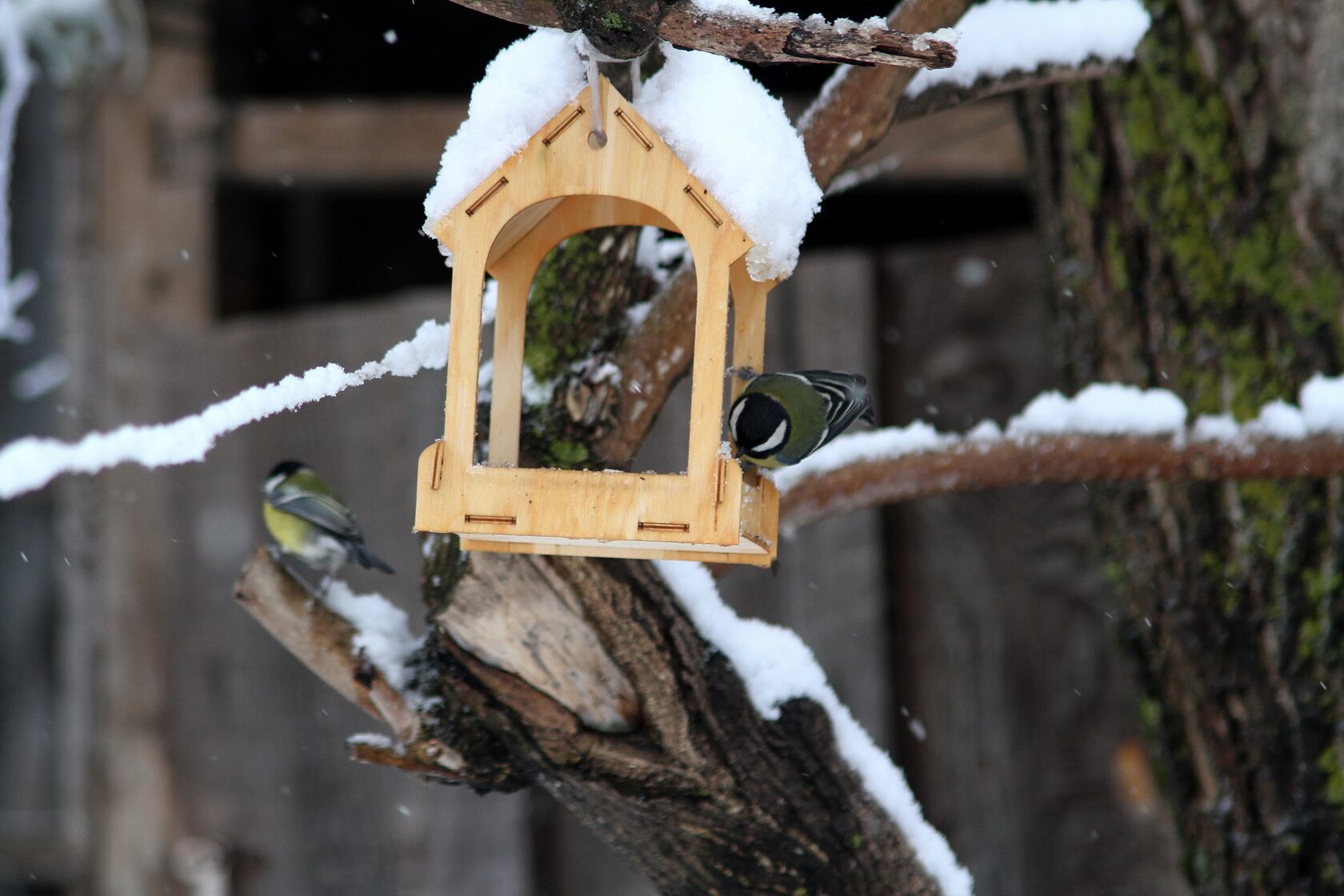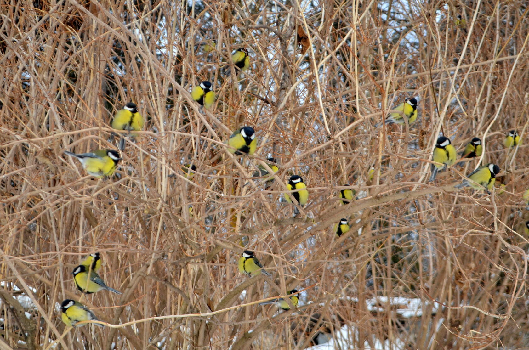 Пернатое население в эту пору больше тяготеет к человеческому жилью. Большинство, конечно, представлено большими синицами Parus major.
