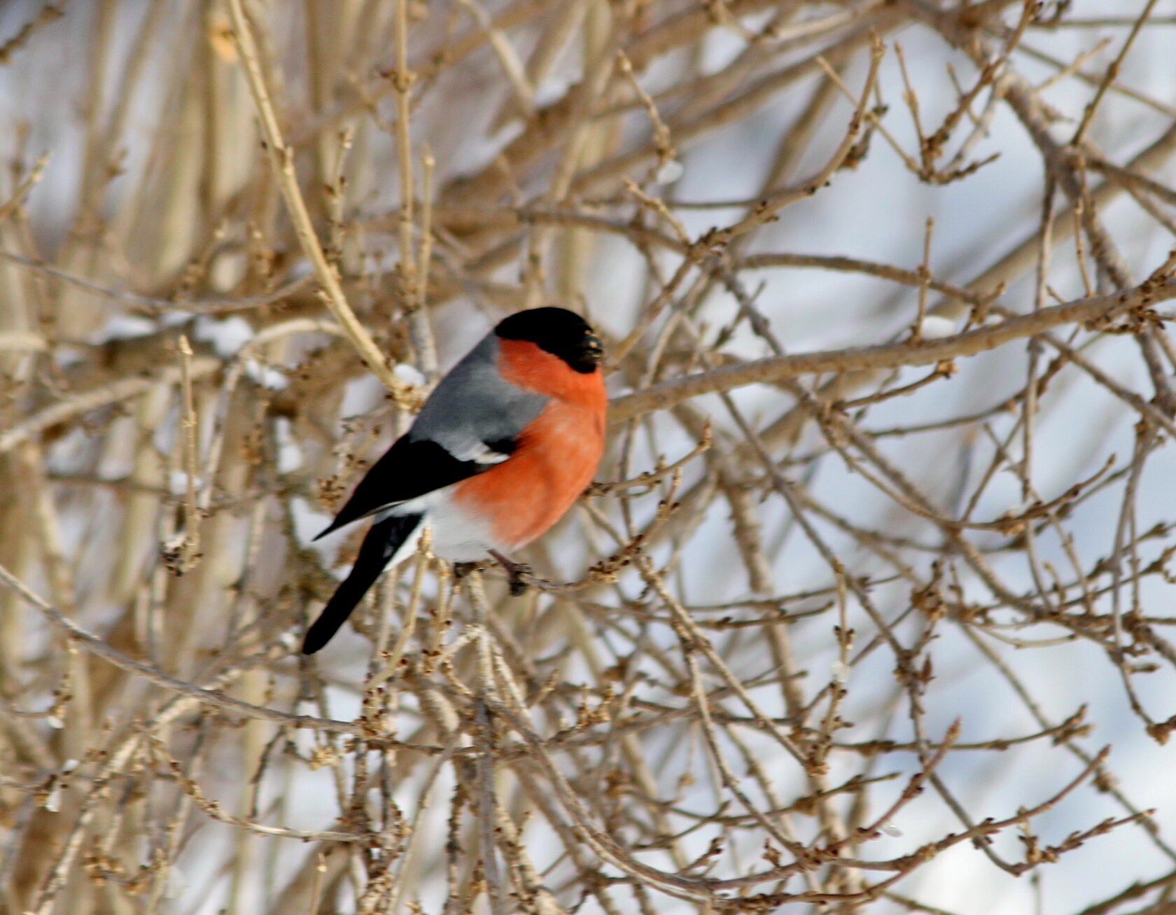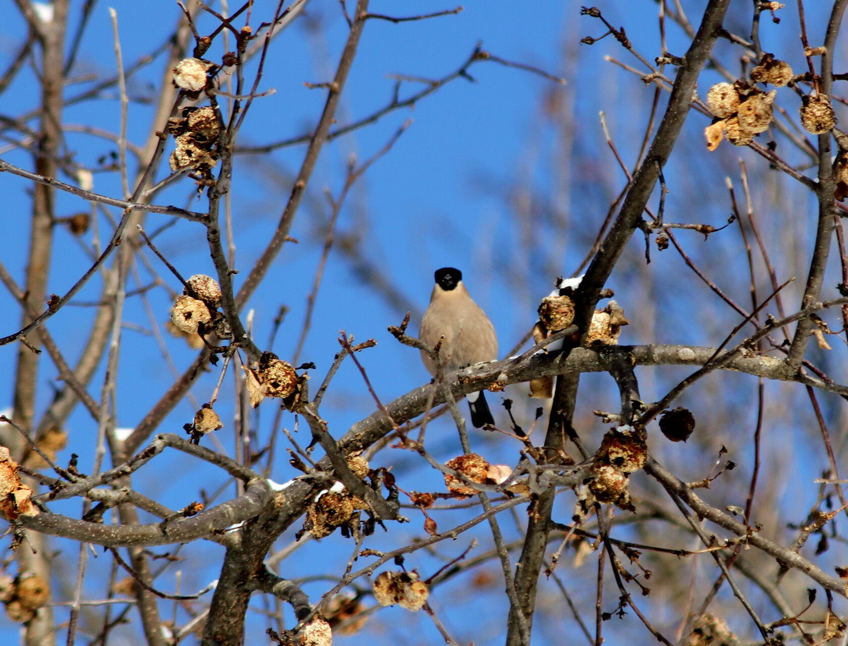 Снегири Pyrrhula pyrrhula тоже стали прилетать к месту подкормки синиц.