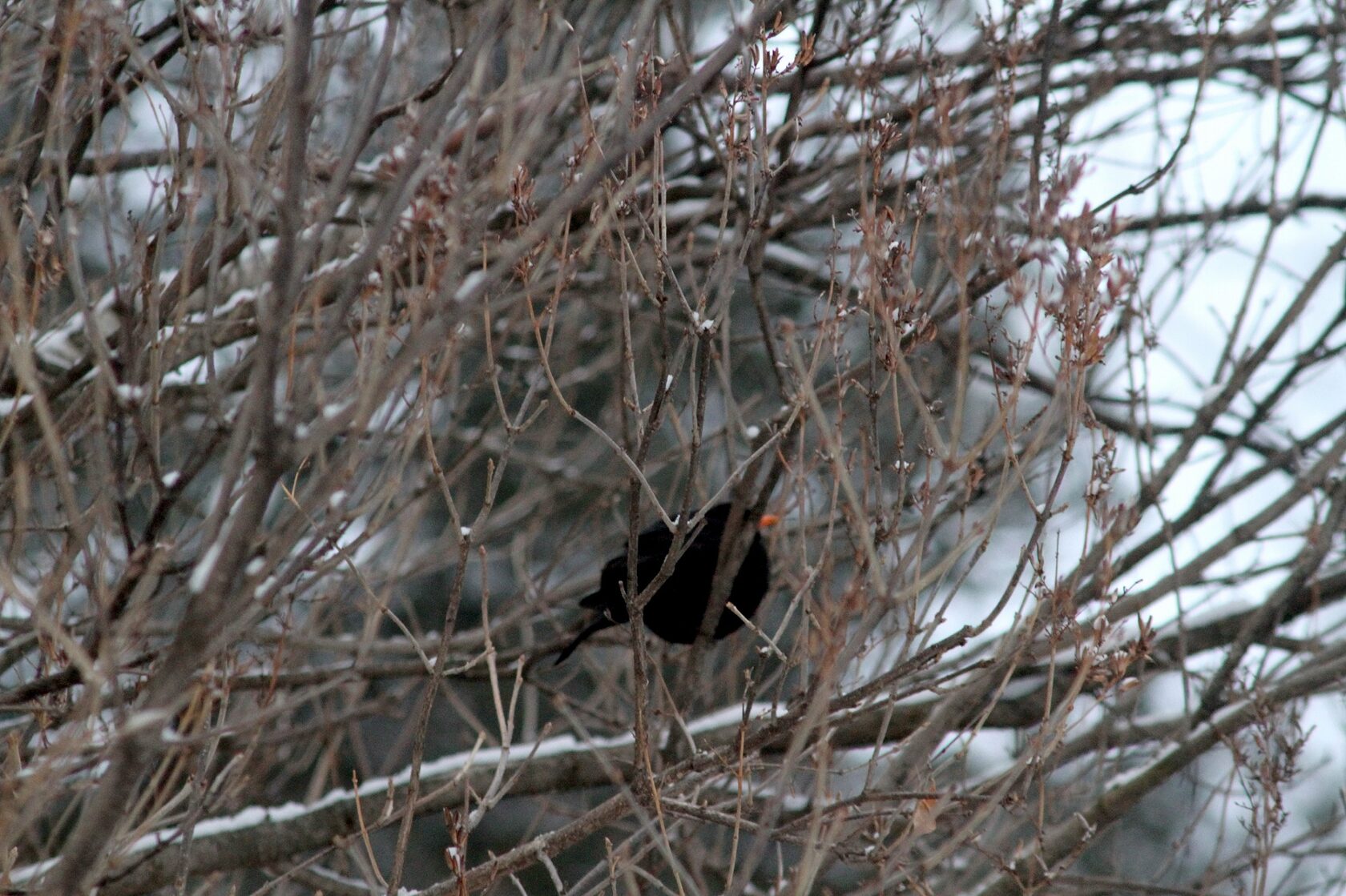 Все зиму продержались несколько дроздов, среди них — черный Turdus merula.